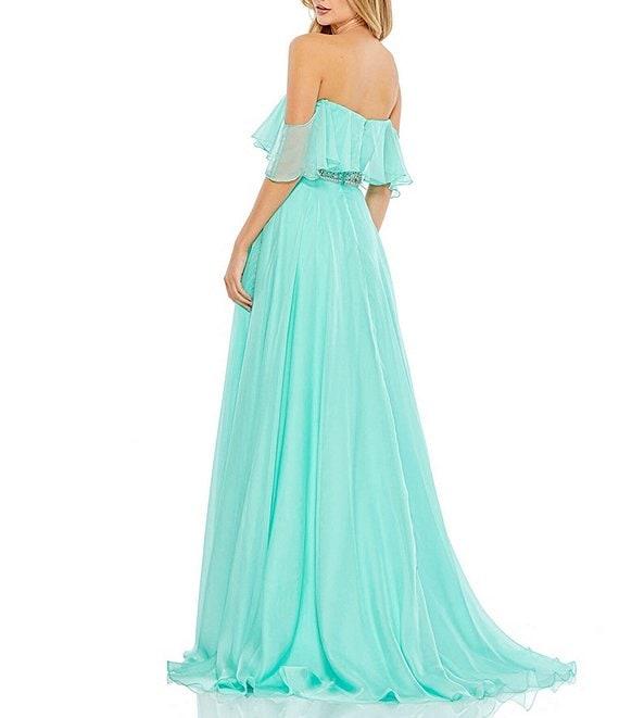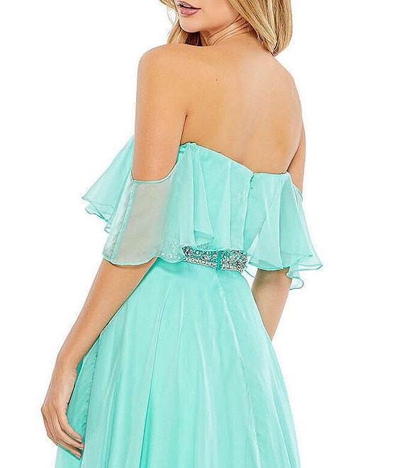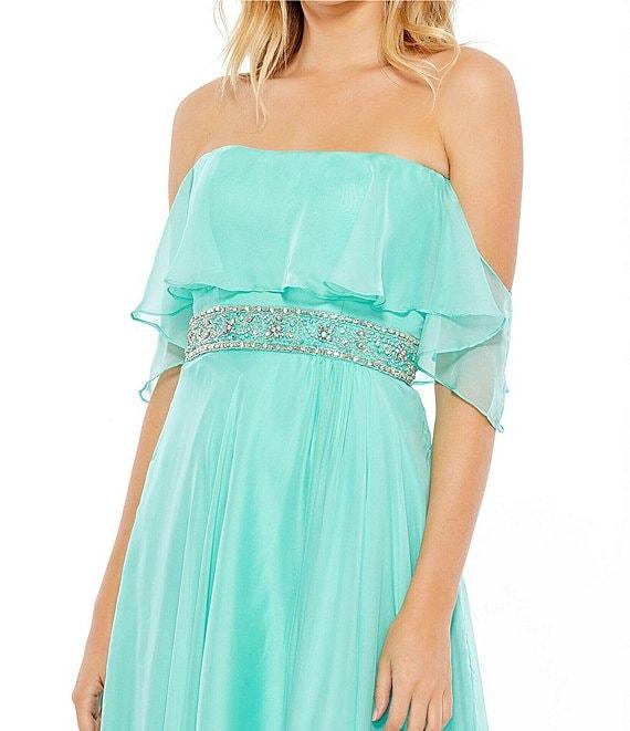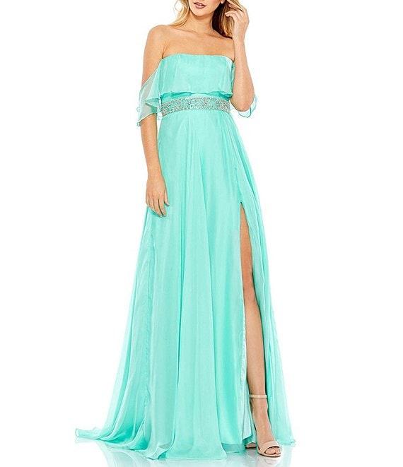 From Mac Duggal, this gown features: off-the-shouldershort sleevessoft fabricbeaded waistfront side slit fully lined center zip back closure approx. 62.5" length from shoulder to hempolyester spot clean Imported.