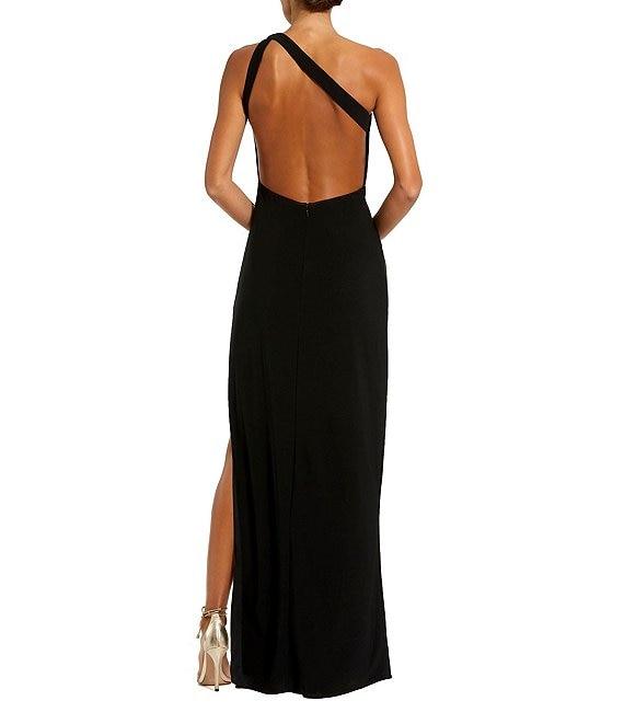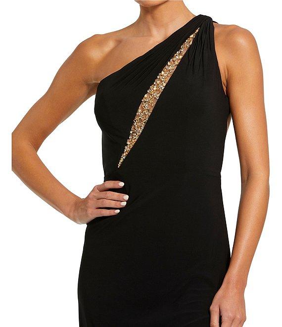 Mac Duggal One Shoulder Beaded Inset Cut Out Back Jersey Column Gown