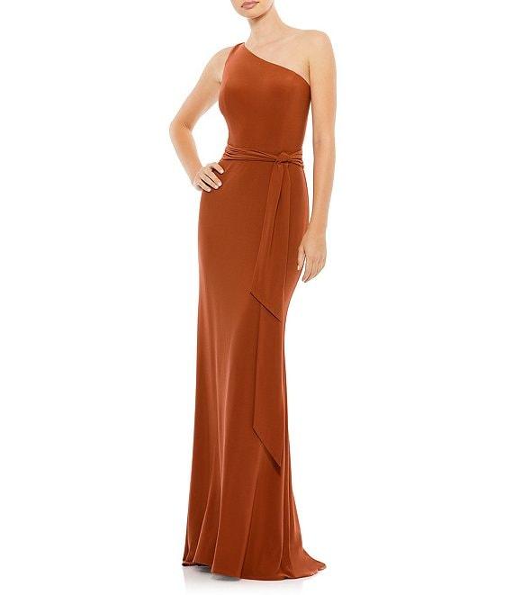 From Mac Duggal, this gown features: Trumpet gown silhouette Jersey fabrication Asymmetrical neckline One shoulder Belted Concealed back zipper Lined Approx. length 60" Polyester Dry clean Imported.