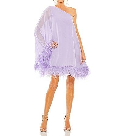 From Mac Duggal, this dress features:all over satin fabrication Shift silhouetteone shoulder neckline One long sleevesfeather trim embellishment fully linedcenter zip back closure Approx. 35 in length from shoulder to hempolyesterspot clean Imported.