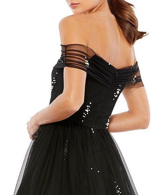 From Mac Duggal, this dress features: A-line silhouette off-the-shoulder neckline cap sleeves covered back pearl embellished midi dress lined center back zip closure approx. 46" from shoulder to hem polyester spot clean/lay flat to dry Imported.