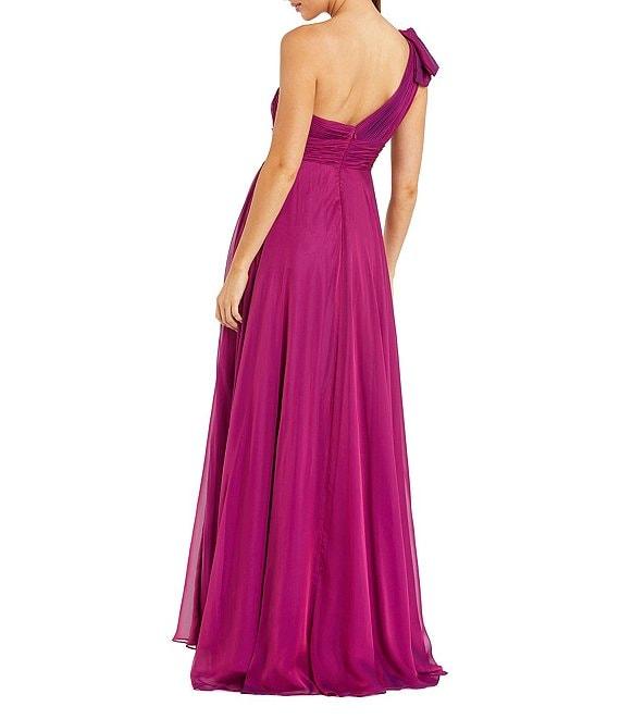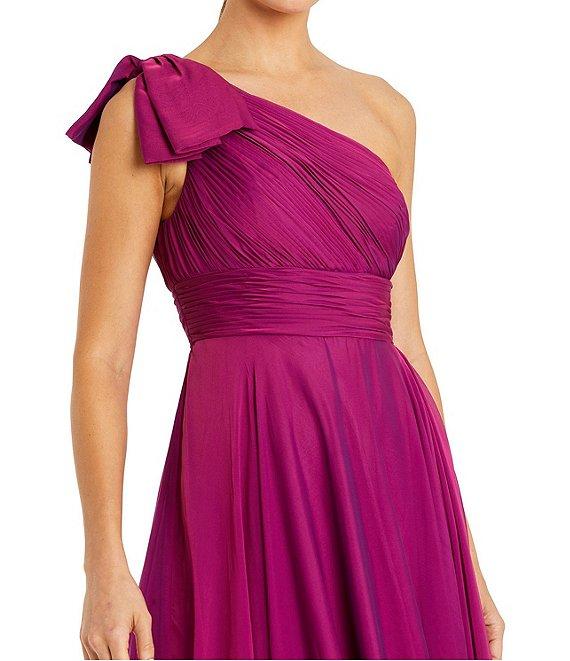 Mac Duggal Petite Size Bow One Shoulder Ruched Bodice Chiffon A Line Gown