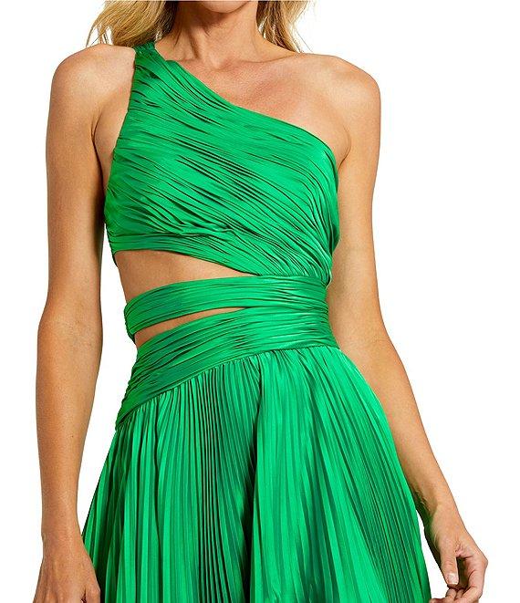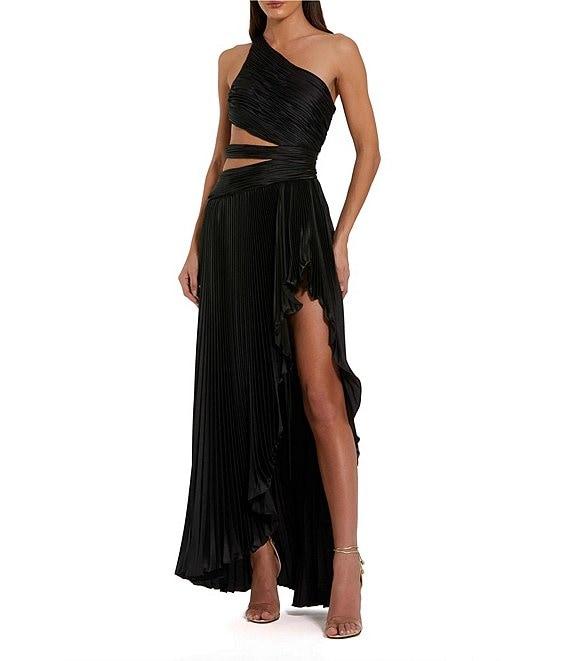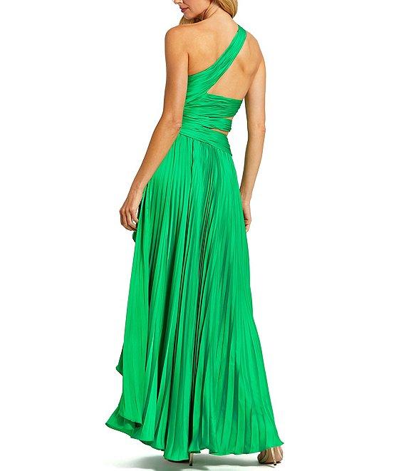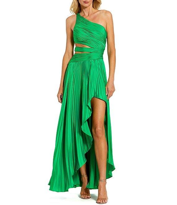 From Mac Duggal, this dress features: Pleated charmeuse fabrication One shoulder neckline Sleeveless Back/side cutout Front slit Side zip closure Approx. 53.5" length Polyester Spot clean Imported.
