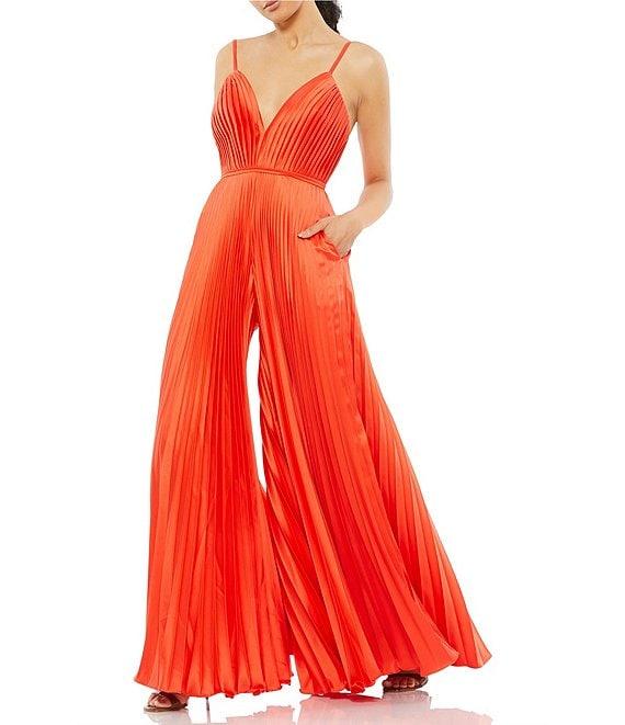 Mac Duggal Pleated Deep V-Neck Spaghetti Strap Sleeveless Wide Leg Jumpsuit