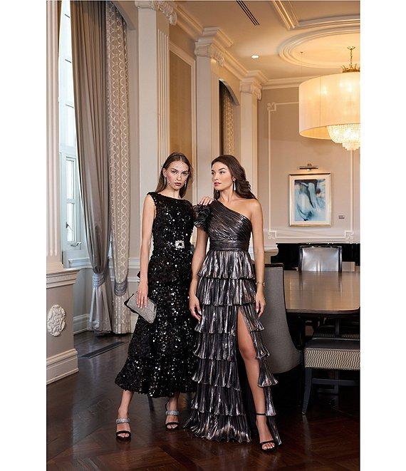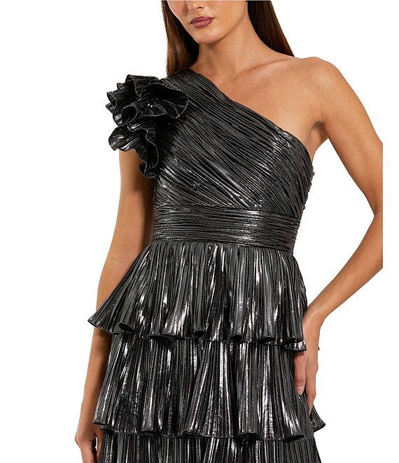 Mac Duggal Pleated Metallic Tiered Ruffle One Shoulder Gown