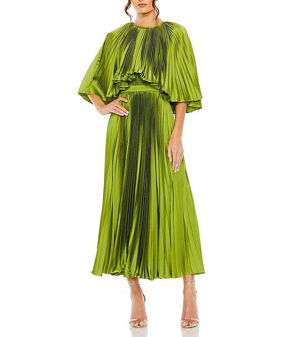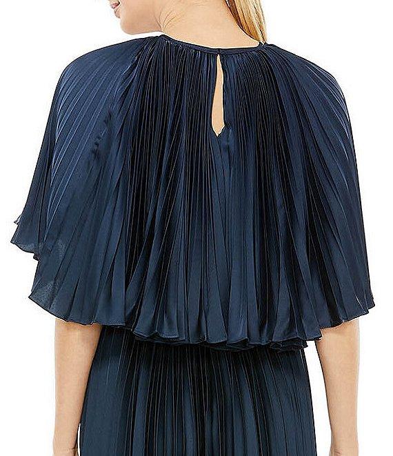From Mac Duggal, this dress features: caplet back and pleated fabrication crew neckline short sleeves belted fully lined center zip back closure approx. 61" length from shoulder to hemline polyester spot clean Imported.