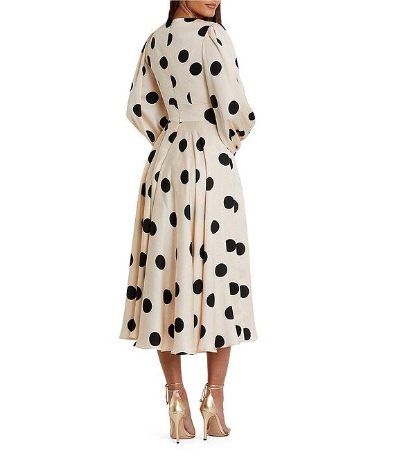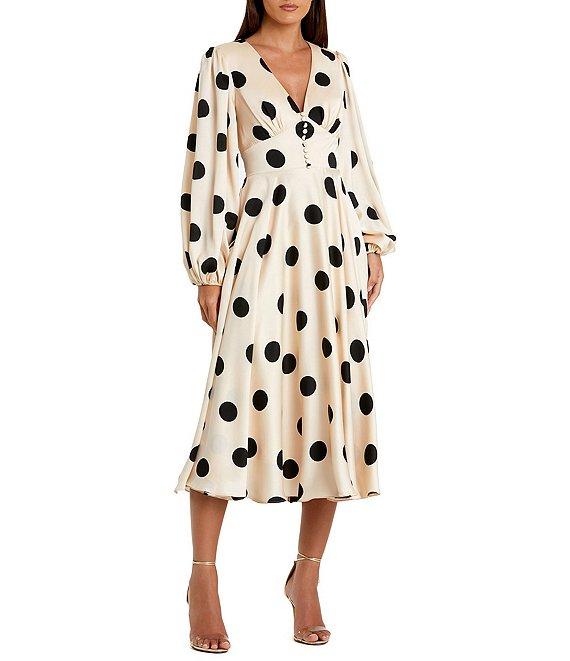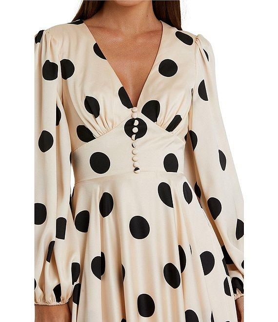 From Mac Duggal, this dress features: Satin charmeuse fabrication A-line silhouette Polka dotted print V-neckline Long puff sleeves with elastic cuffs Button front detail Fully lined Flutter hemline Concealed back zip closure Approx. 60" length Polyester Hand wash Imported.