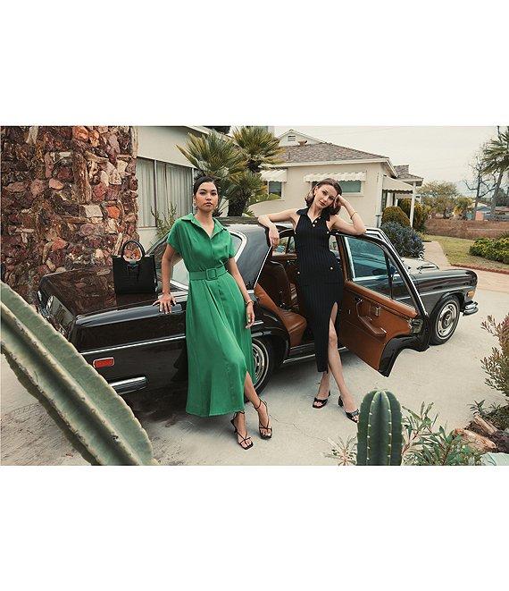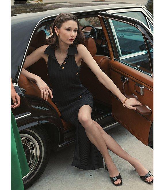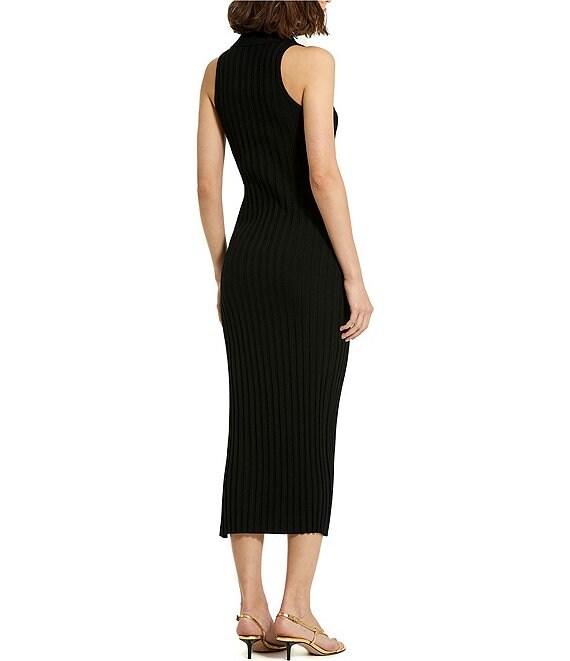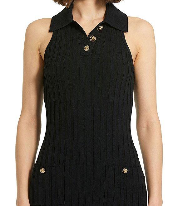 From Mac Duggal, this dress features: Ribbed knit fabrication Sheath silhouette Point collar Sleeveless Side front decorative button pockets Fitted Midi length Fully lined Straight hemline with side slit Button front closure Approx. 48" length Rayon/nylon Hand wash Imported.