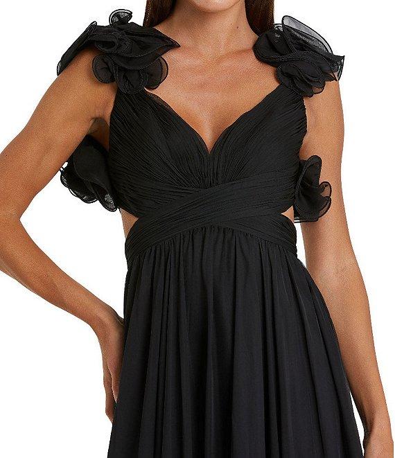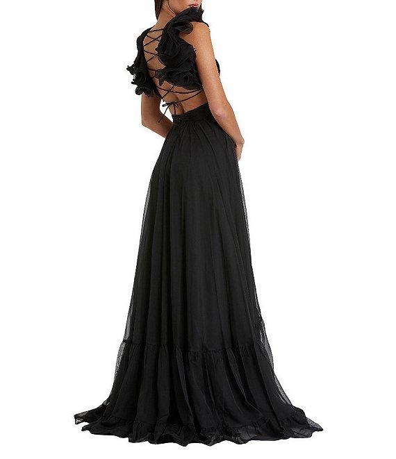 From Mac Duggal, this dress features: Chiffon fabrication A line silhouette V-neckline Sleeveless Large shoulder ruffles Side cut outs Lace up back Zip back closure Approx. 60" length Polyester Hand wash cold Imported.