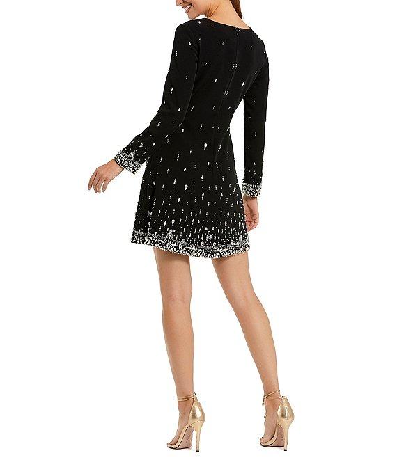 From Mac Duggal, this dress features: Embellished fabrication Shift silhouette Round neckline Long sleeves Beading details No pockets Concealed back zip closure Approx. 35" length Polyester Hand wash Imported.