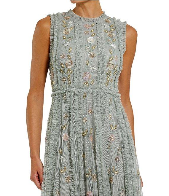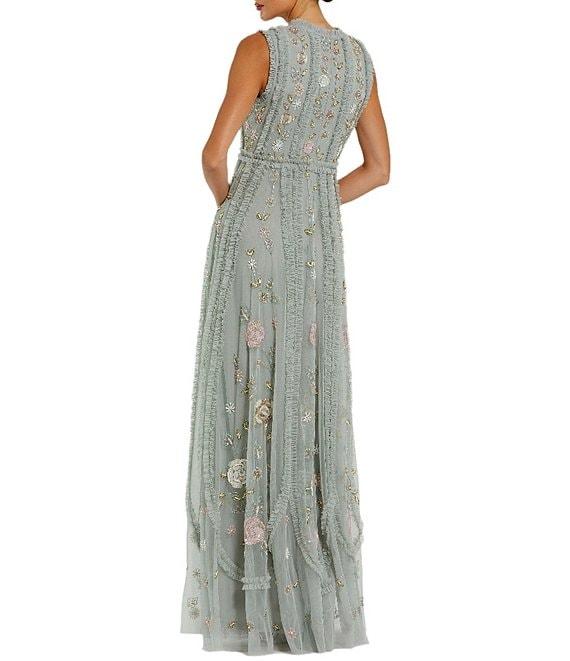 Mac Duggal Ruffle Mock Neck Floral Embroidered Micro Ruffle A-Line Gown