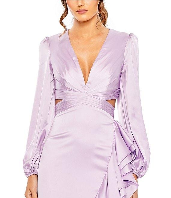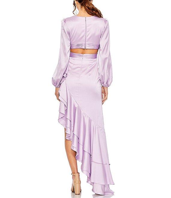 Mac Duggal Satin Deep V-Neck Long Balloon Sleeve Cut-Out Side Tiered Ruffle Asymmetrical Hemline Gown