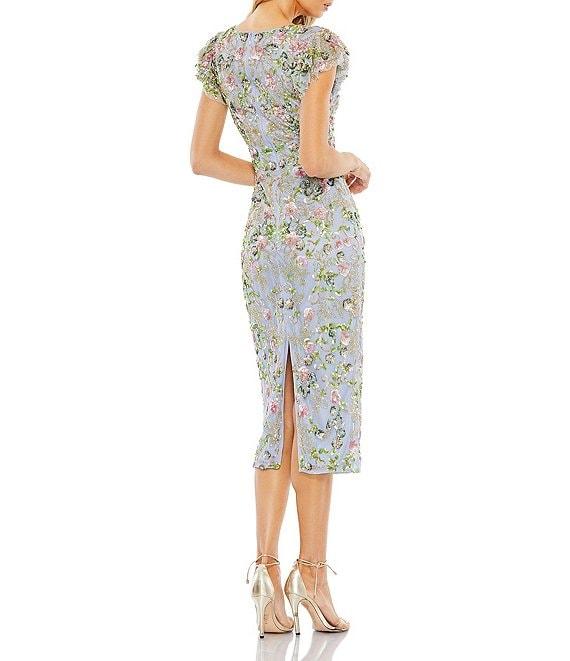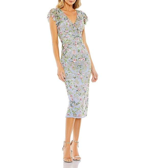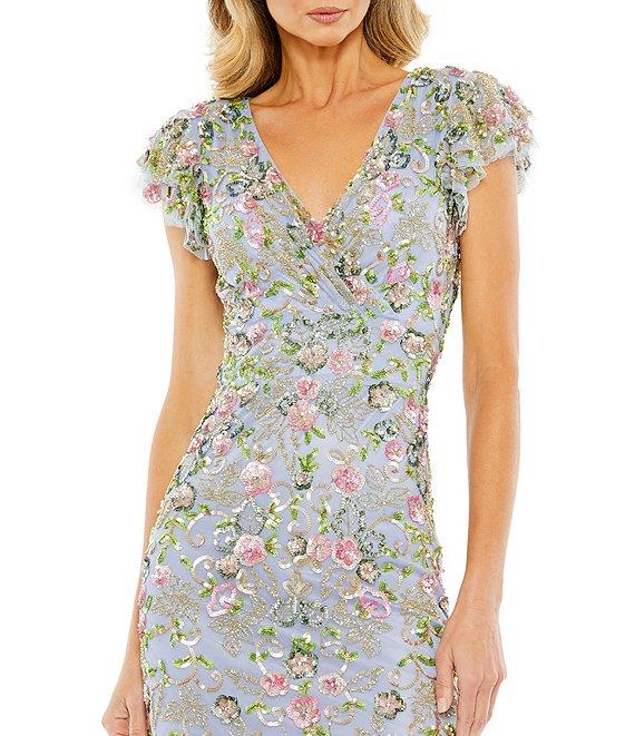 From Mac Duggal, this dress features all over sequin fabrication Sheath silhouette surplice v-neckline flutter cap sleeves midi length fully lined center zip back closure Approx. 45" in length from shoulder to hem polyester spot clean Imported.