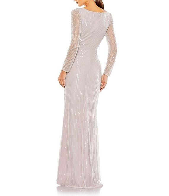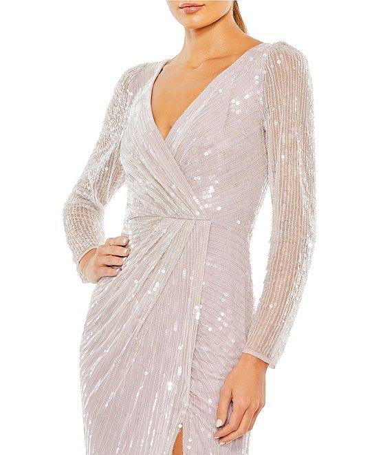 From Mac Duggal, this gown features: Sequin fabrication Faux wrap silhouette Surplice v-neckline Long sleeves Side slit Lined Center back zip closure Approx. 63.5" from shoulder to hem Polyester Spot clean Imported.