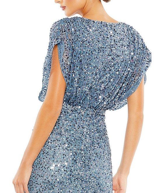 From Mac Duggal, this gown features: all over sequin fabrication Sheath silhouette surplice v-neckline draped 3/4 sleeves Blouson bodice fully lined center zip back closure Approx. 61" in length from shoulder to hem polyester spot clean Imported.
