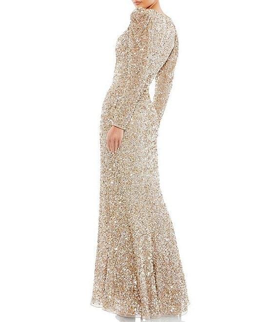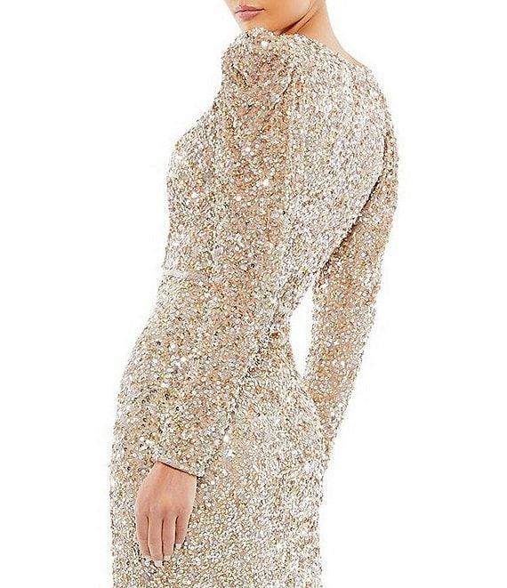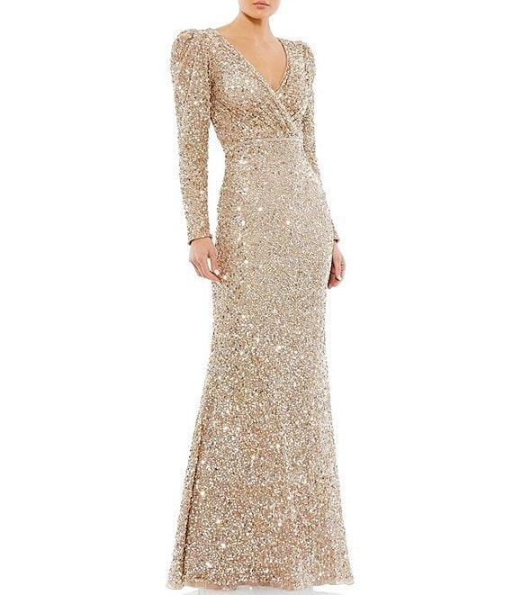 From Mac Duggal, this gown features:fully sequin fabrication faux wrap silhouettesurplice v-neckline long puff sleeves scoop back detailintended to hit the floorlined center back zip closureapprox. 63" from shoulder to hem polyesterspot clean/lay flat to dry Imported.