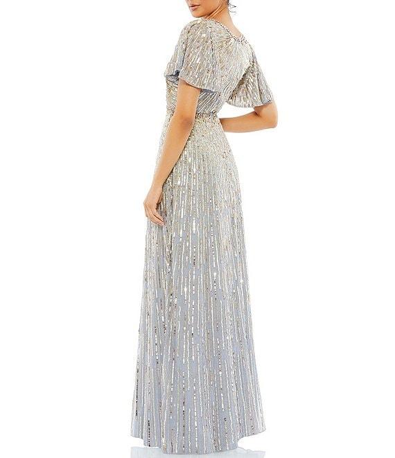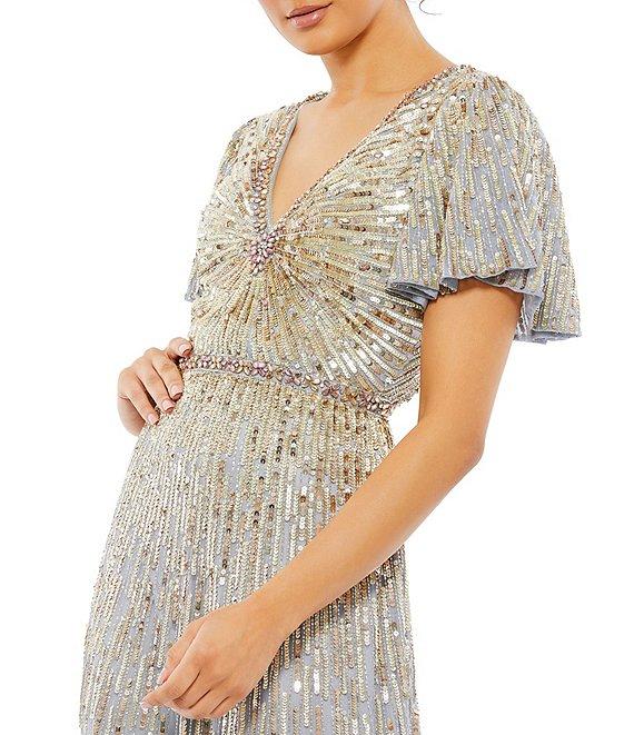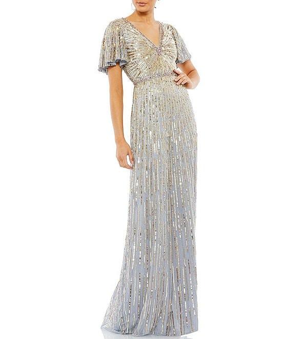 From Mac Duggal, this gown features:All over sequined fabricationV-neckline Short butterfly sleevesFully lined Center back zip closureApprox. 62.5" length from hipsPolyester Spot clean/lay flat to dry Imported.
