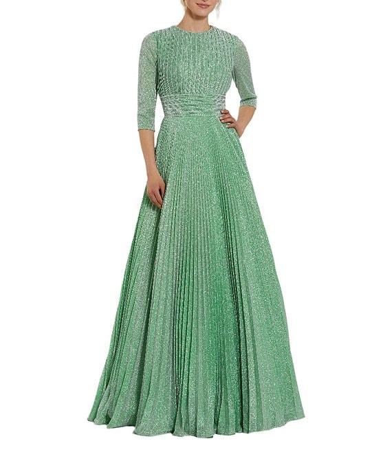 Mac Duggal Shimmer Georgette Crew Neck 3/4 Sleeve Pleated A-Line Gown