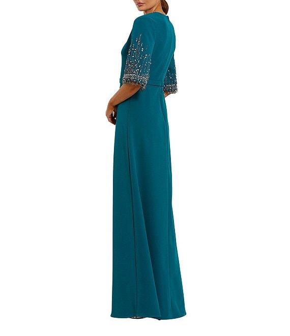 Mac Duggal Short Beaded Sleeve Crepe A-Line Gown