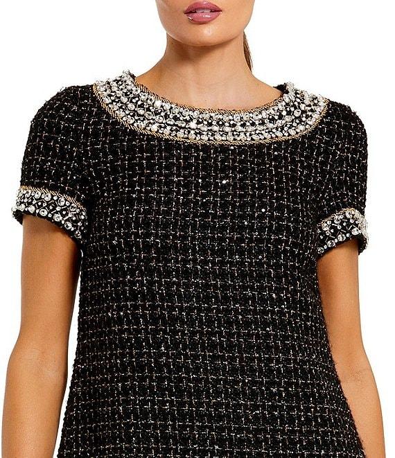 From Mac Duggal, this dress features: Tweed fabrication Sheath silhouette Crew neckline Short sleeves Jeweled trim Zip back closure Approx. 35" length Polyester Hand wash cold Imported.
