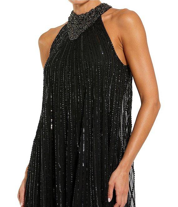 From Mac Duggal, this dress features: Mesh sequin fabrication Sheath silhouette Halter neckline Sleeveless Sequin embellishments Zip back closure Approx. 60" length Polyester Hand wash cold Imported.