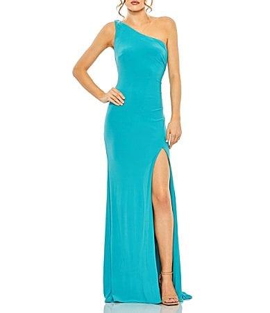 From Mac Duggal, this gown features:jersey fabricationsheath silhouetteasymmetric one shoulder necklinesleevelessside slitdraped backlinedside zip closureapprox. 63 from shoulder to hempolyesterspot clean/dry flatImported.