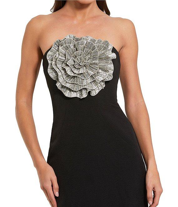 Mac Duggal Strapless 3D Rhinestone Flower Crepe Column Gown