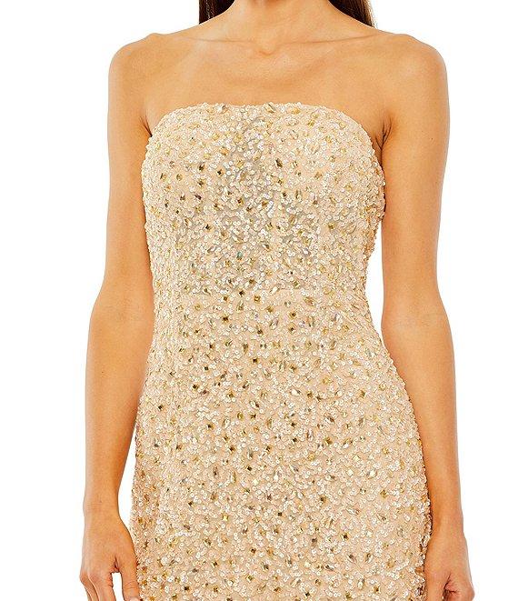 From Mac Duggal, this dress features: Mesh fabrication Sheath silhouette Strapless neckline Sleeveless Sequin beaded embellishments Zip back closure Approx. 35" length Polyester Hand wash Imported.