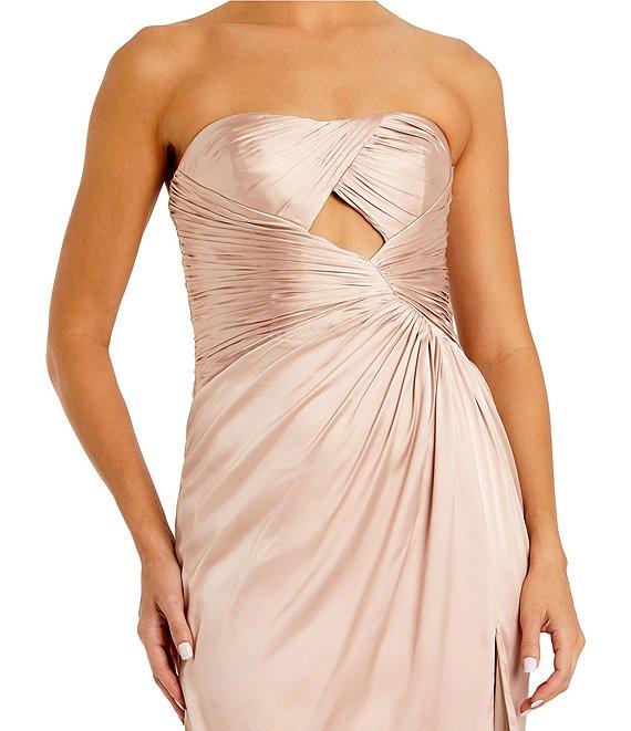 From Mac Duggal, this dress features: Satin/charmeuse fabrication Column gown silhouette Strapless neckline Sleeveless Cut out detail Back sash train High side slit Zip back closure Approx. 60" length Polyester Hand wash cold Imported.