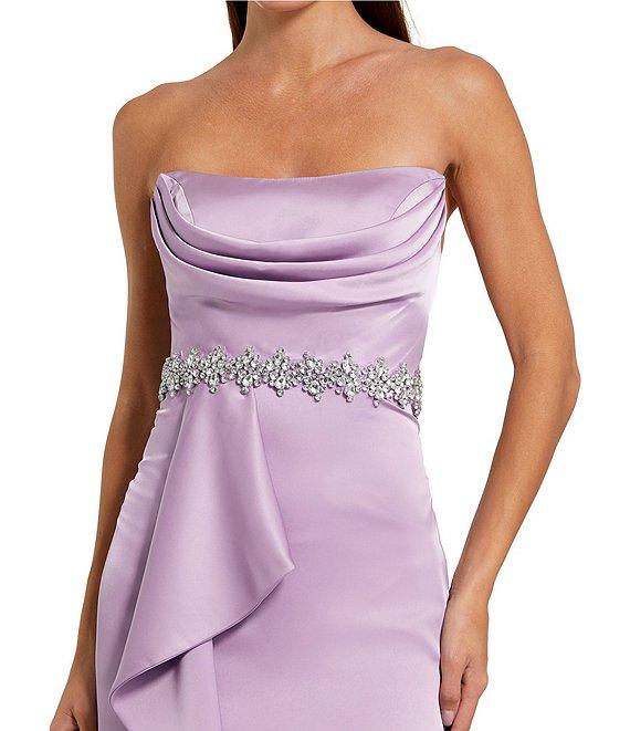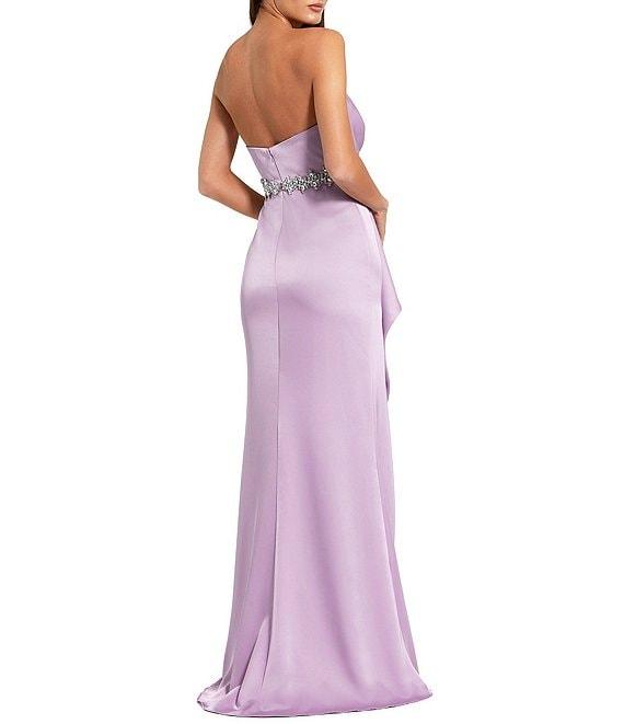 From Mac Duggal, this gown features:Sheath silhouetteSatin fabricationStraplessDraped bodiceBeaded waistRuffle front detailFront slitZip back closureLinedApproximate length 62"PolyesterSpot cleanImported.