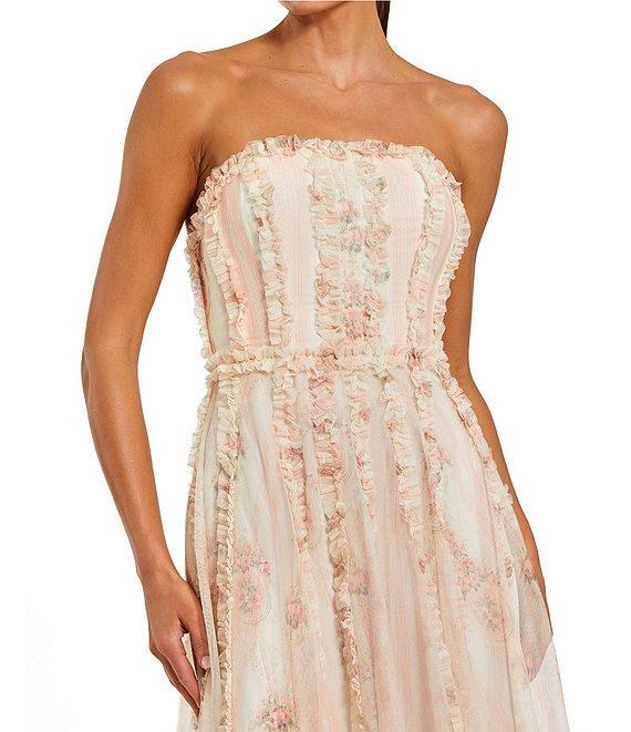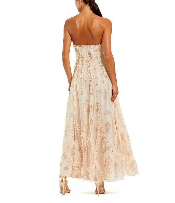 Mac Duggal Strapless Floral Print Micro Ruffle Mesh Maxi Dress