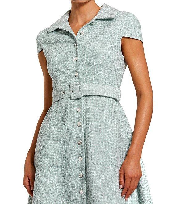 From Mac Duggal, this dress features: Tweed boucle fabrication A-line silhouette Point collar neckline Cap sleeves Front patch pockets Belted Fully lined Straight hemline Button front closure Approx. 45" length Polyester Hand wash Imported.