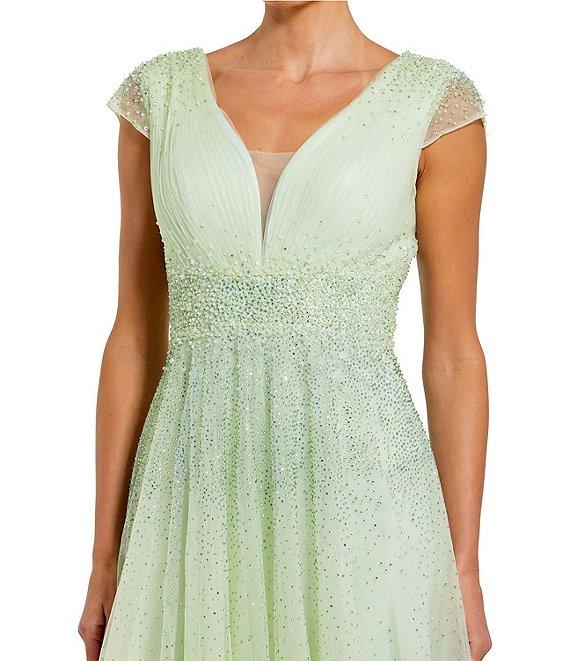 From Mac Duggal, this dress features: Tulle fabrication A-line silhouette V-neckline Cap sleeves Beaded embellishment Zip back closure Approx. 60" length Polyester Hand wash cold Imported.