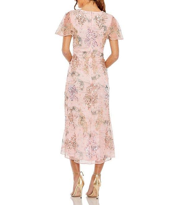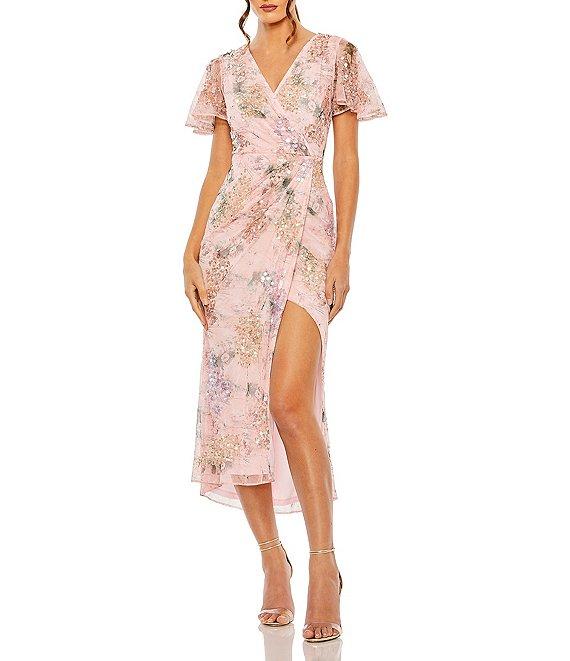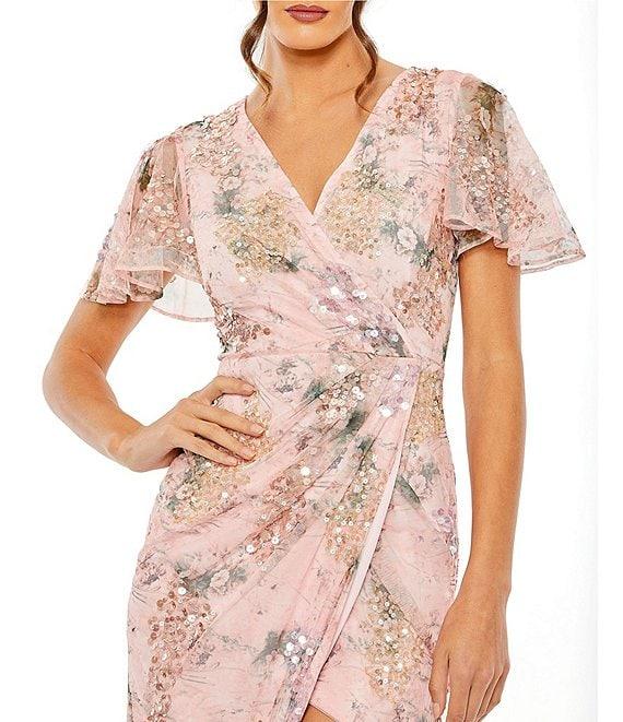 From Mac Duggal, this dress features: Faux wrap silhouette Printed mesh fabrication Sequined detailing Surplice v-neckline Short flutter sleeves Side ruching Tulip skirt Zip back closure Lined Approx. 48" length Polyester Hand wash cold Imported.