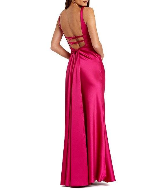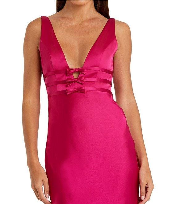From Mac Duggal, this gown features:Sheath silhouetteSatin fabricationV-necklineSleevelessBow trim detailZip back closureLinedApprox. 60" lengthPolyesterHand wash coldImported.