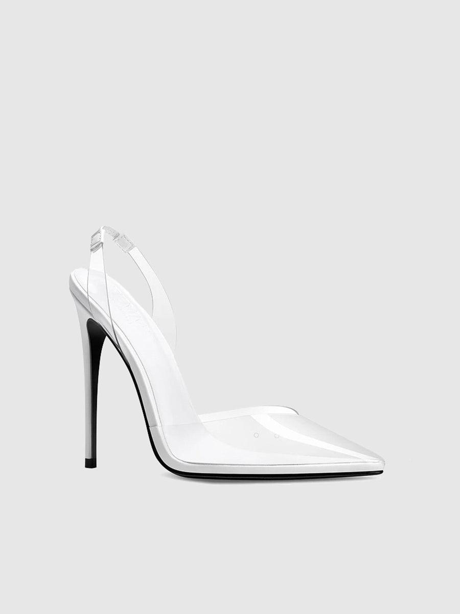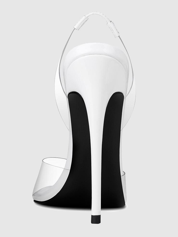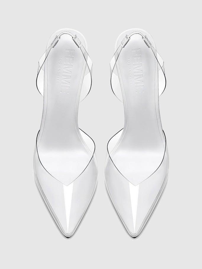 The Macallan Slingback pump features spiked stiletto heels and delicate PVC slingback straps, perfectly complementing the transparent pointed toebox for a modern and sophisticated look. Vegan upperVegan InsoleVegan outsoleClosed-Pointed toeSlingback strap HandmadeDesigned in LASelf-covered stiletto heel, 4.75" (120mm)As seen on Kylie Jenner
