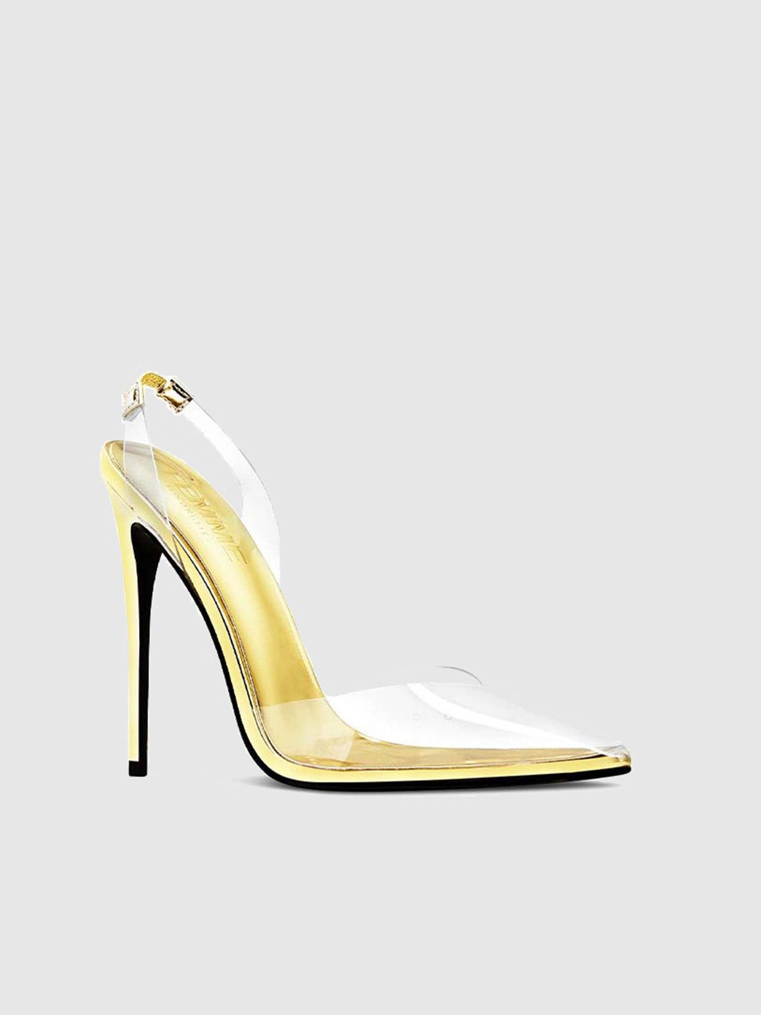 FINAL SALE The Macallan Slingback pump features spiked stiletto heels and delicate PVC slingback straps, perfectly complementing the transparent pointed toebox for a modern and sophisticated look. Vegan upper Vegan Insole Vegan outsole Closed-Pointed toe Slingback strap Handmade Designed in LA Self-covered stiletto heel, 4.75" (120mm) As seen on Hailey Bieber