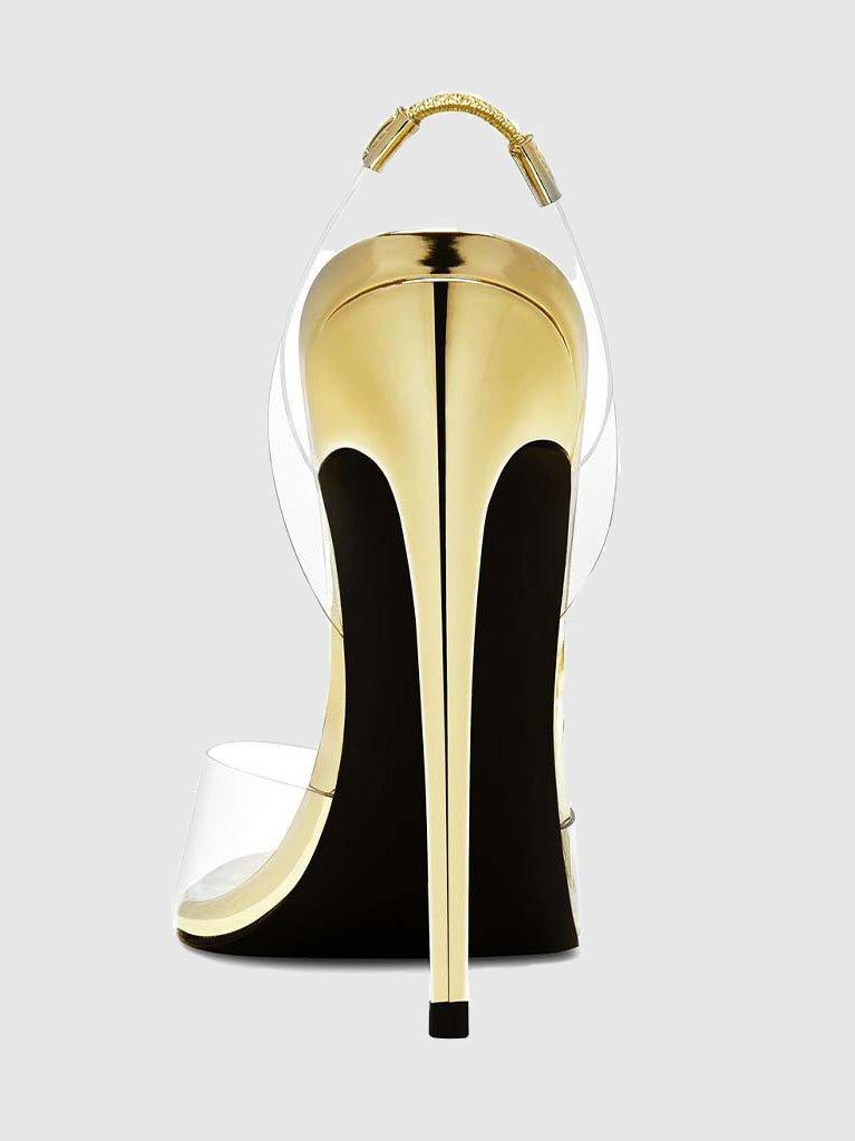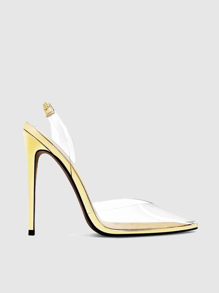 The Macallan Slingback pump features spiked stiletto heels and delicate PVC slingback straps, perfectly complementing the transparent pointed toebox for a modern and sophisticated look.Vegan upperVegan InsoleVegan outsoleClosed-Pointed toeSlingback strap HandmadeDesigned in LASelf-covered stiletto heel, 4.75" (120mm)As seen on Hailey Bieber