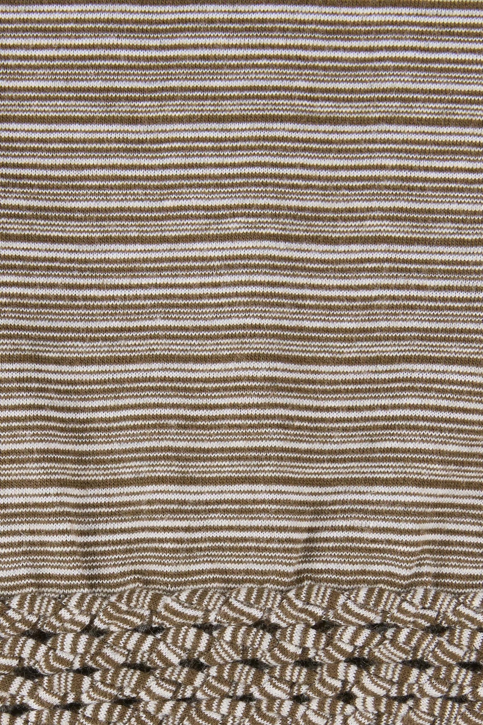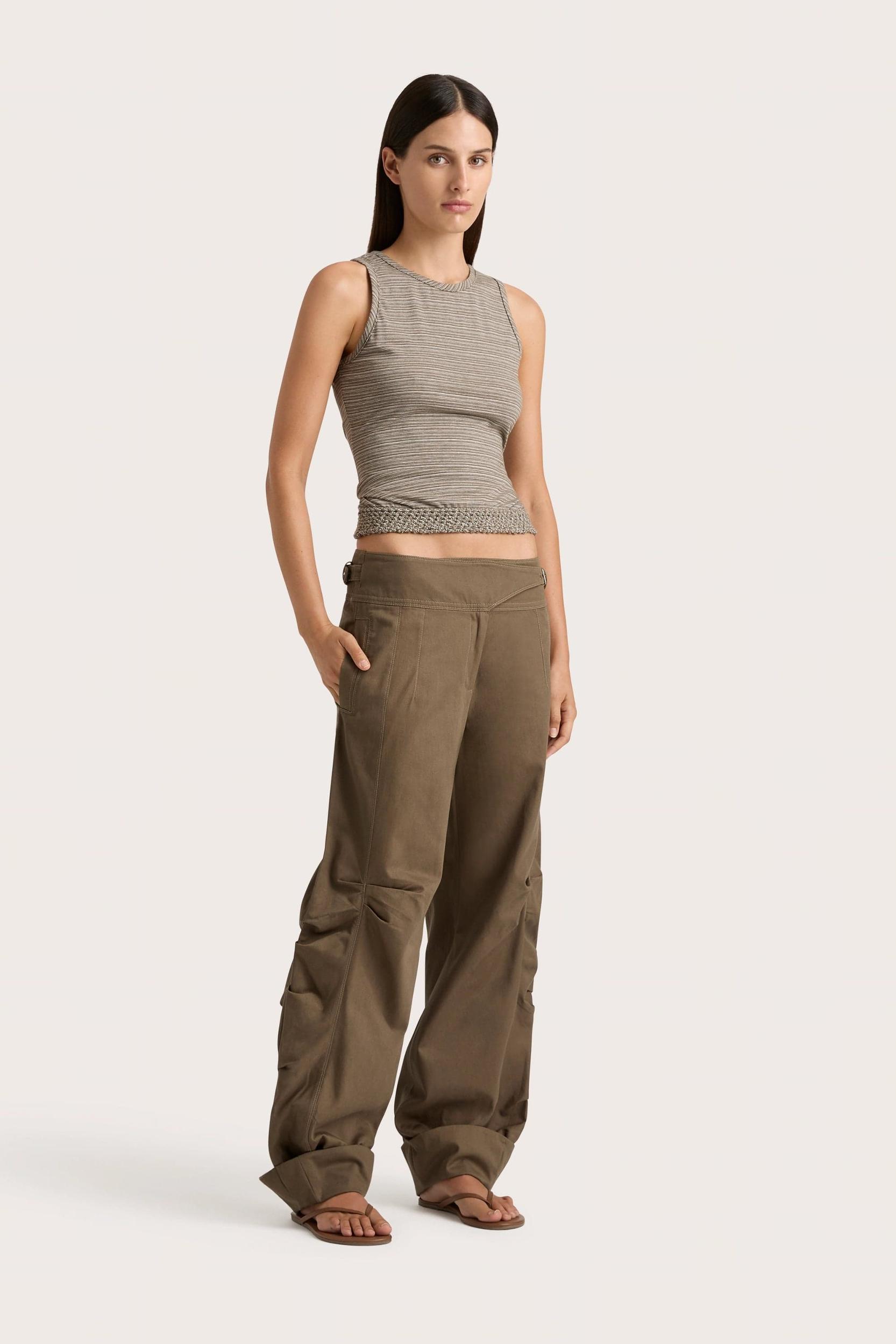 A fitted sleeveless tee with a high-cut neckline and handwoven macrame around the hemline, cropping at the hips. Crafted from 100% cotton jersey in Walnut Blush Stripe, it softly clings to the body whilst allowing for stretch and movement. Style with the Calais Pant for an off-duty approach.