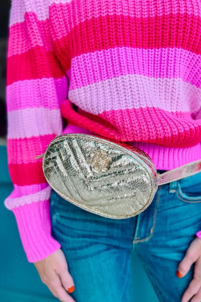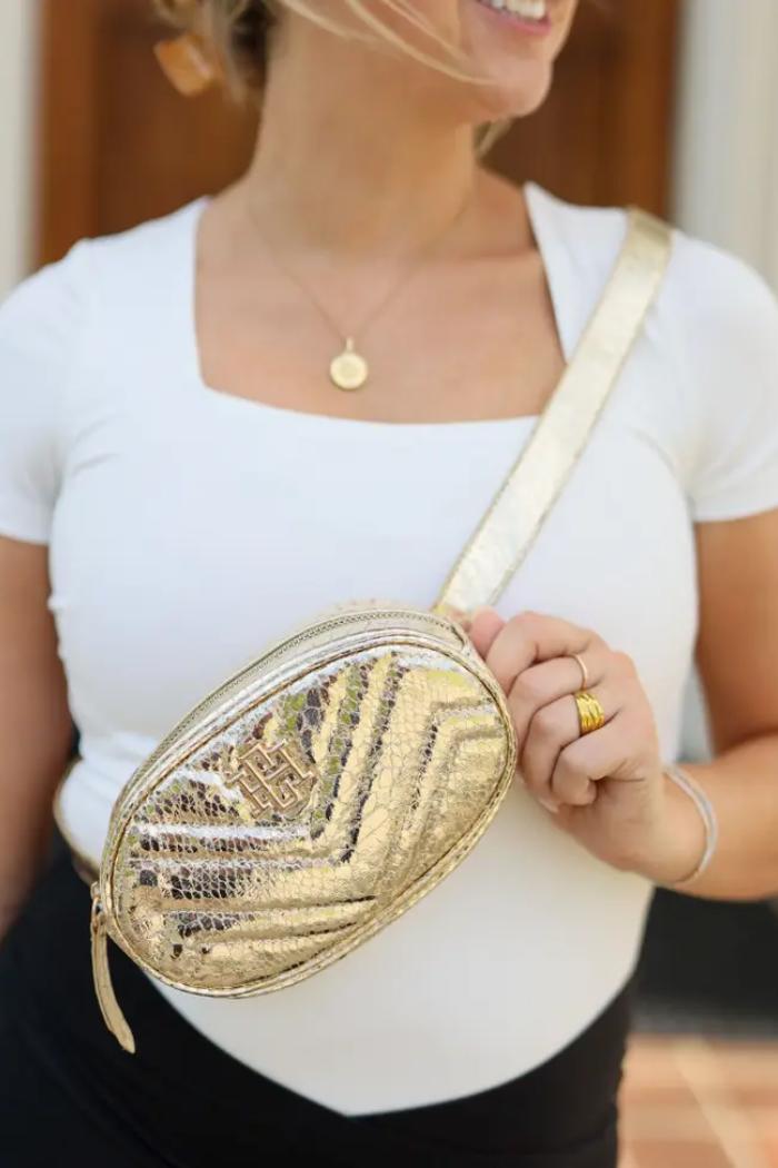 This fashion forward belt bag has a V quilted pattern with the Carolina Hill logo on the front. It has a top zipper leading to the interior of the bag. The strap is adjustable and makes it easy to wear across the body or as a traditional belt bag around the waist.