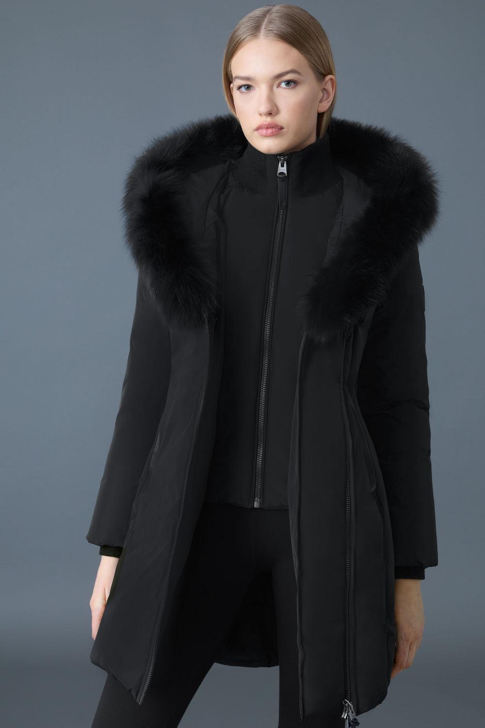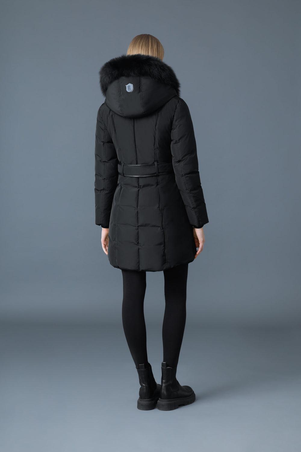 Details : The KAY-BX is a chic three-quarter down coat designed for women, featuring Mackage’s signature collar adorned with luxurious blue fox fur. Crafted with recycled down for warmth and eco-friendly flair, it flaunts an edgy asymmetrical zipper and a cozy inner bib with a ribbed collar. Stay dry and snug with water-resistant, windproof fabric, plus storm cuffs and insulated leather welt pockets lined with fleece for extra toasty vibes. With a tailored fit that hugs your shape, this winter essential keeps you stylishly warm down to -25°C. Perfect for light layers—go up a size if you want to bundle up more! Style : KAY-BX