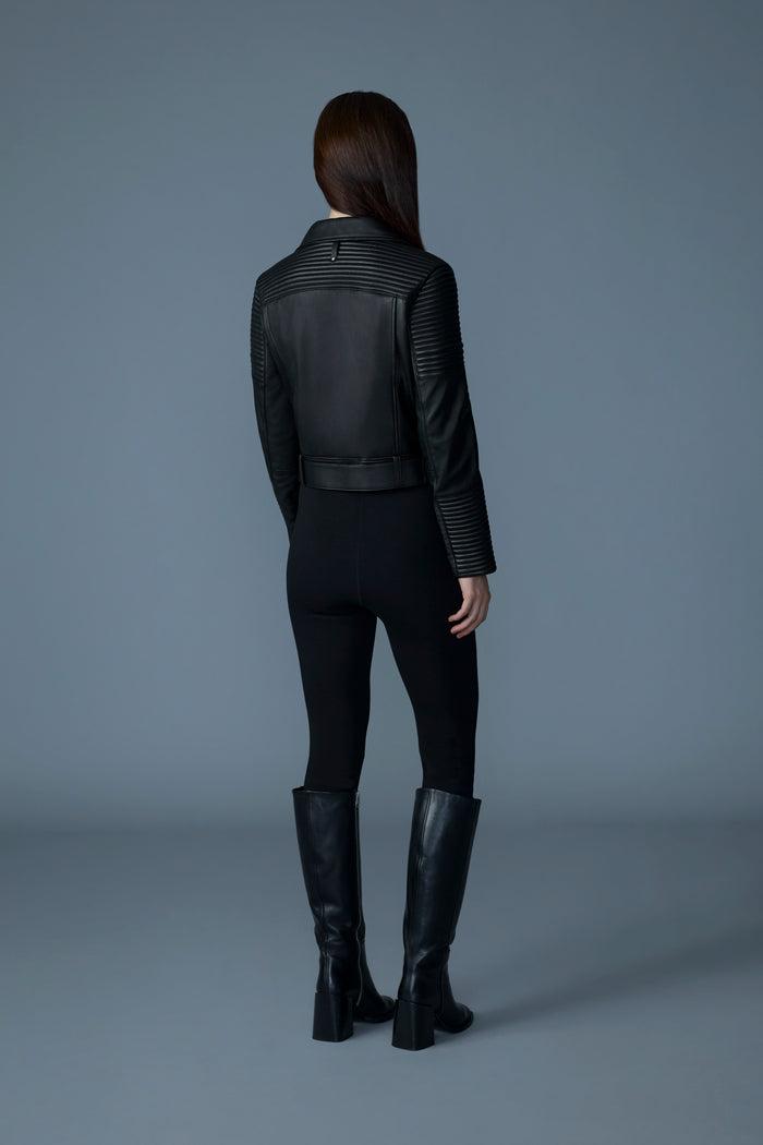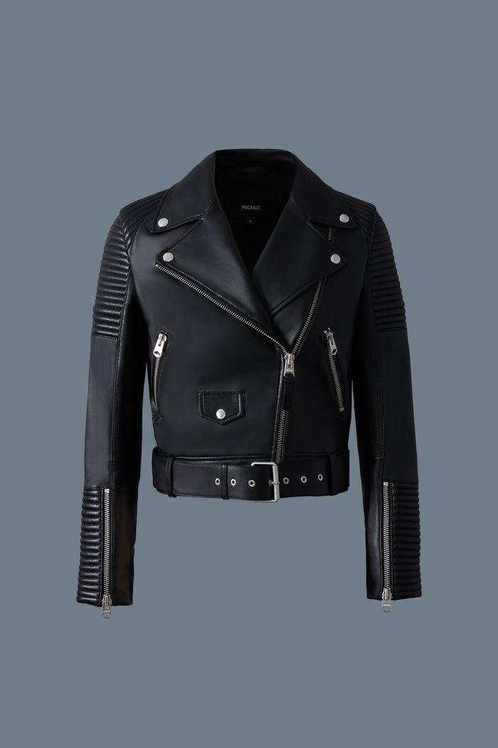 Ride in style with MASINA, the premium biker jacket made from lamb leather. The adjustable belt and fully lined interior offer a customized fit and extra warmth. This semi-fitted jacket boasts an asymmetrical closure and coin pocket detailing. Perfect for adventures and daily wear.