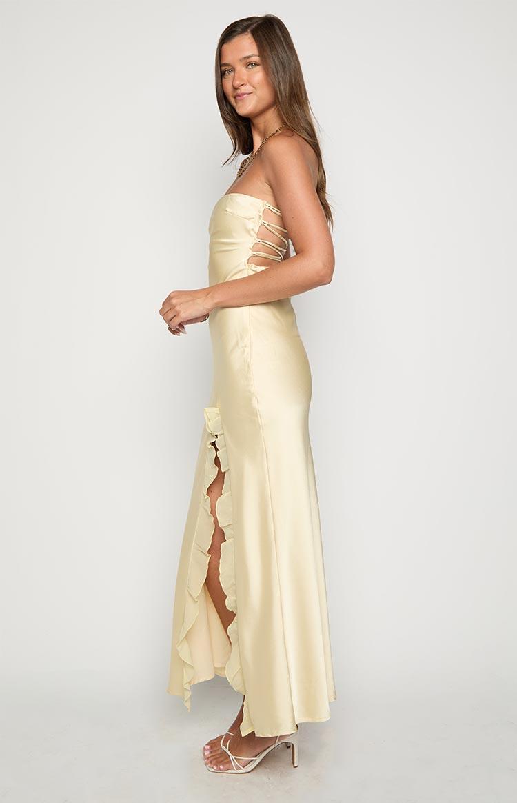 Yellow Strapless Maxi DressHow to style:Step into elegance with our Mackenna Yellow Strapless Maxi Dress! Perfect for formal events or any special occasion, this dress features a beautiful lace-up back, a high thigh split with ruffle detail, and a stunning yellow satin material. Pair with gold jewellery, a shoulder bag, and kitten heels to turn heads at your next formal event!Features: Maxi length Fully lined Strapless style Lace-up back High thigh split with ruffle detail Bias cut Invisible side zipper on skirt Perfect for formal events or prom!