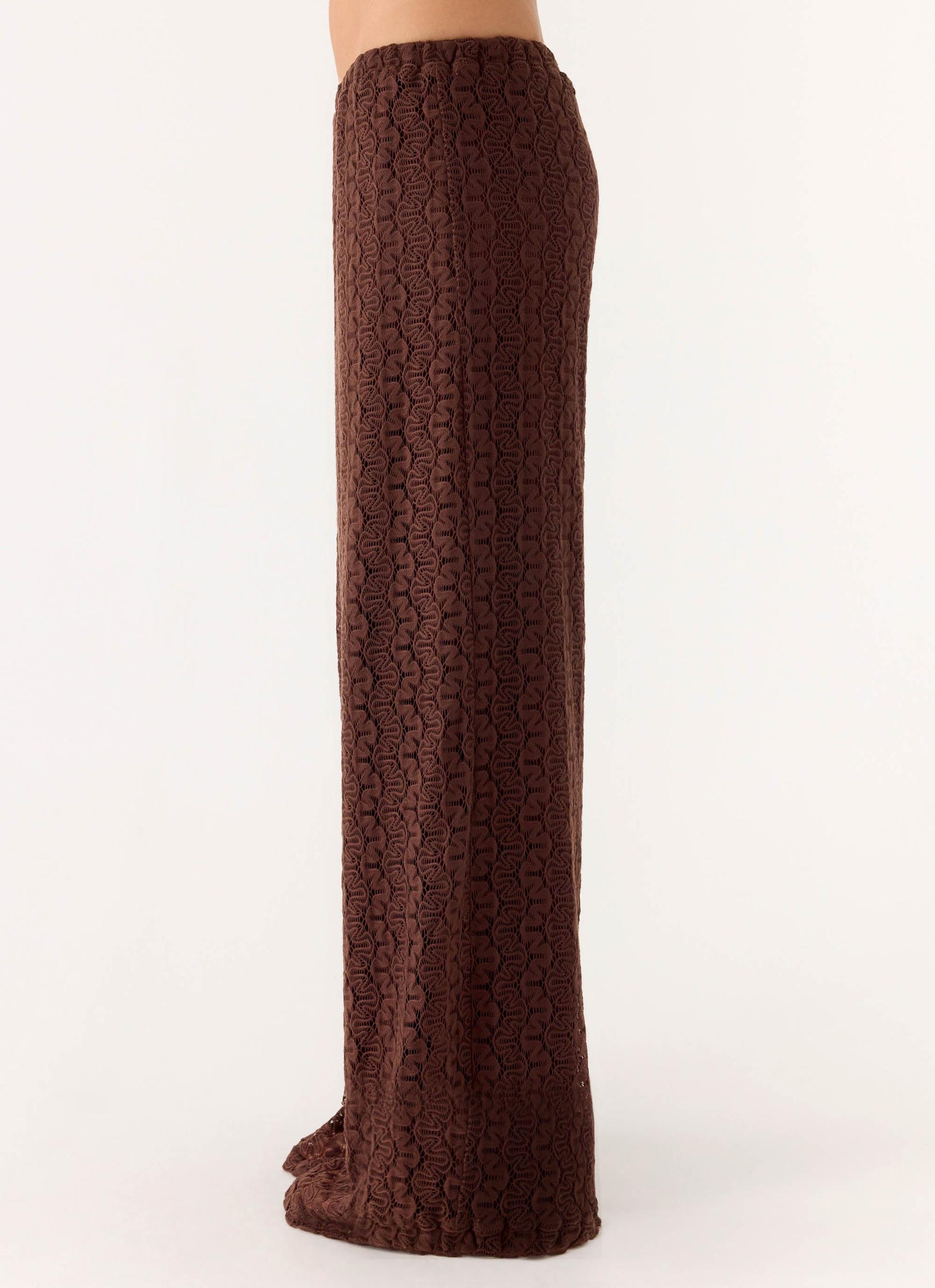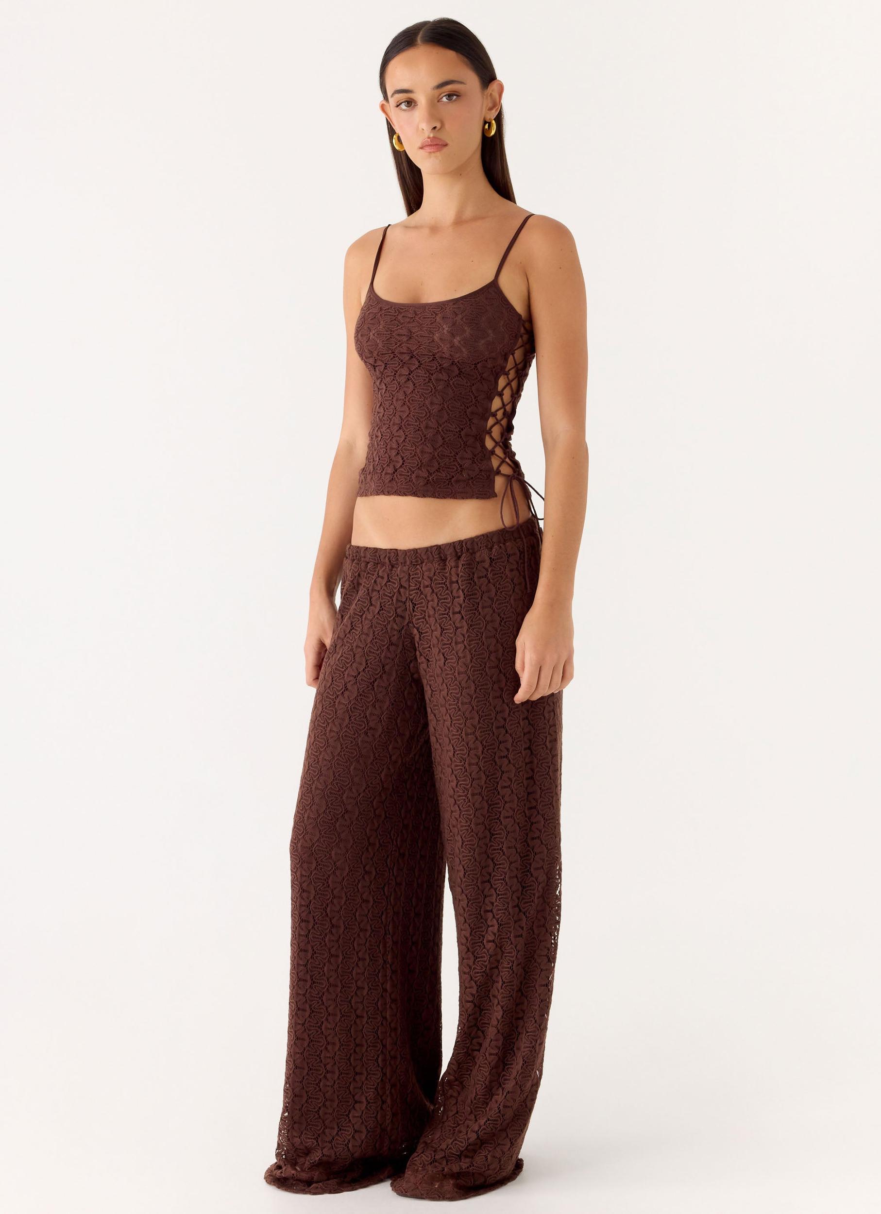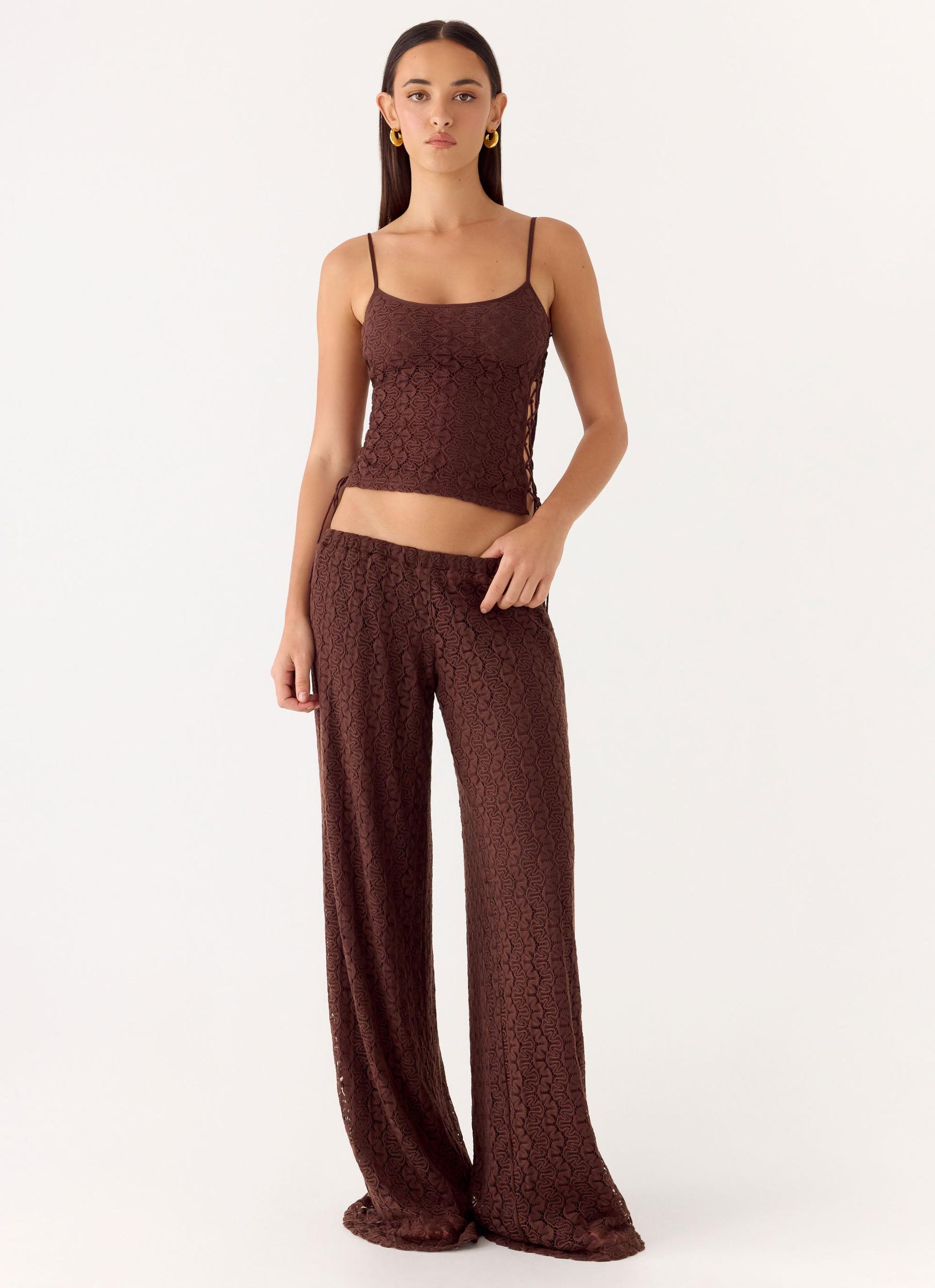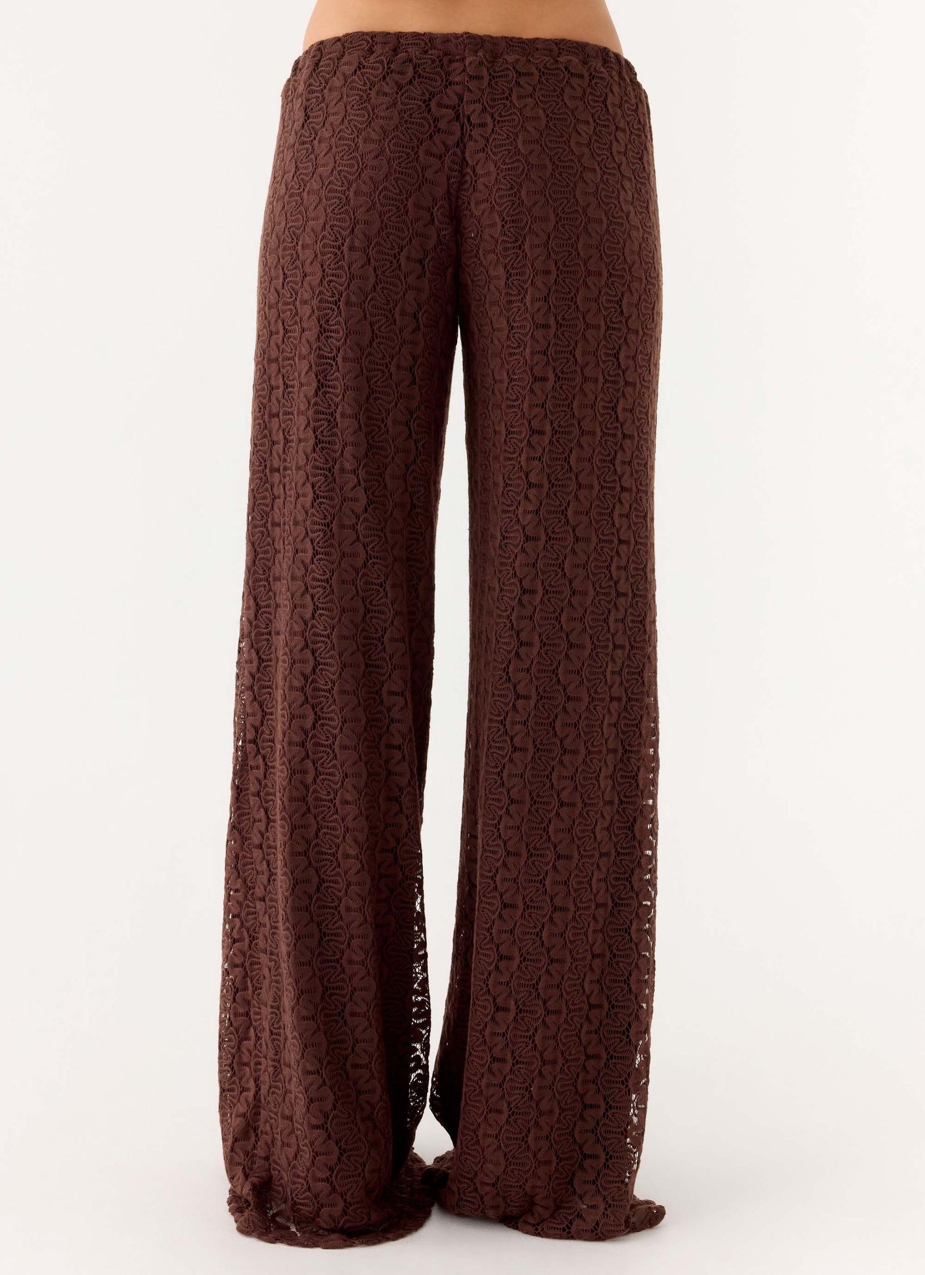 Peppermayo Exclusive The Mackenzie Pants are made for warm days and effortless evening transitions. Featuring a low-rise fit with a structured waistband and delicate crochet detailing, this style skims the body for a flattering, editorial-ready silhouette. Lightweight and comfortable, they’re perfect for sun-soaked escapes and stylish nights out. - Low-rise fit- Waistband- Crochet detailing- Fabric: 100% Polyester Size AU 8 / US 4 garment measurements:Waist: 66 cm / 25.98 inHip: 112 cm / 44.09 inLength: 103 cm / 40.55 in Roberta is 177cm and wears size AU 6 / size US 2