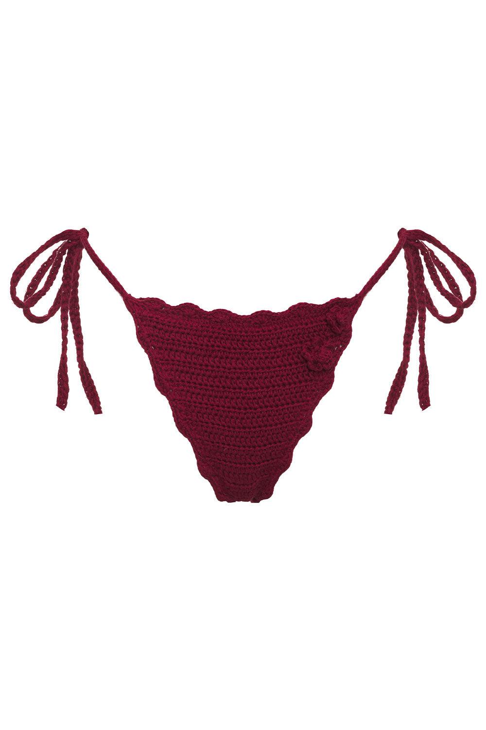 Your summer break bikini bottom is here, featuring cheeky coverage, ultra-soft crochet fabric, dainty string side ties, and an opulent shade of ruby red. Pair this bikini bottom with the matching Chloe bikini top for a set worth living in. Fabric Self: 55% Linen + 45% Cotton Crochet Crochet Fabric Cheeky Coverage Model Size & Fit This style runs true to size Jamea is wearing a size Small Height 5’9” (176m) Bust 34.5” (88cm), Waist 24.5" (62cm), Hips 35.5" (90cm)