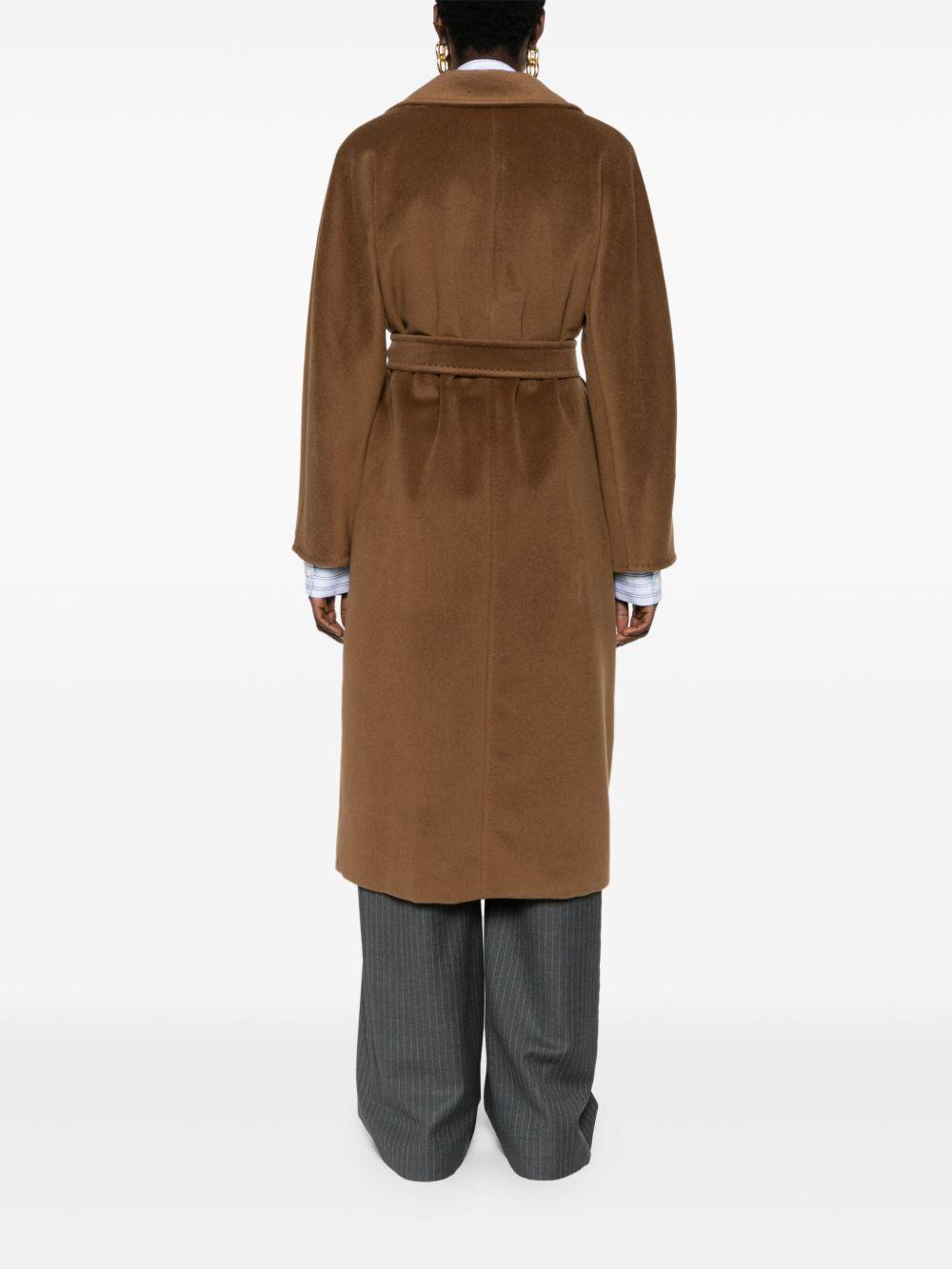 Max Mara Madame 101801 double-breasted coat | Brown | brown | virgin wool-cashmere blend | felted | notched collar | long sleeves | two side welt pockets | detachable waist belt | logo-jacquard lining | long length | straight hem | double-breasted button fastening | Cupro/Viscose/Metallic Fibre/Virgin Wool/Cashmere | Double Breasted & Peacoats | Coats | Clothing | Women