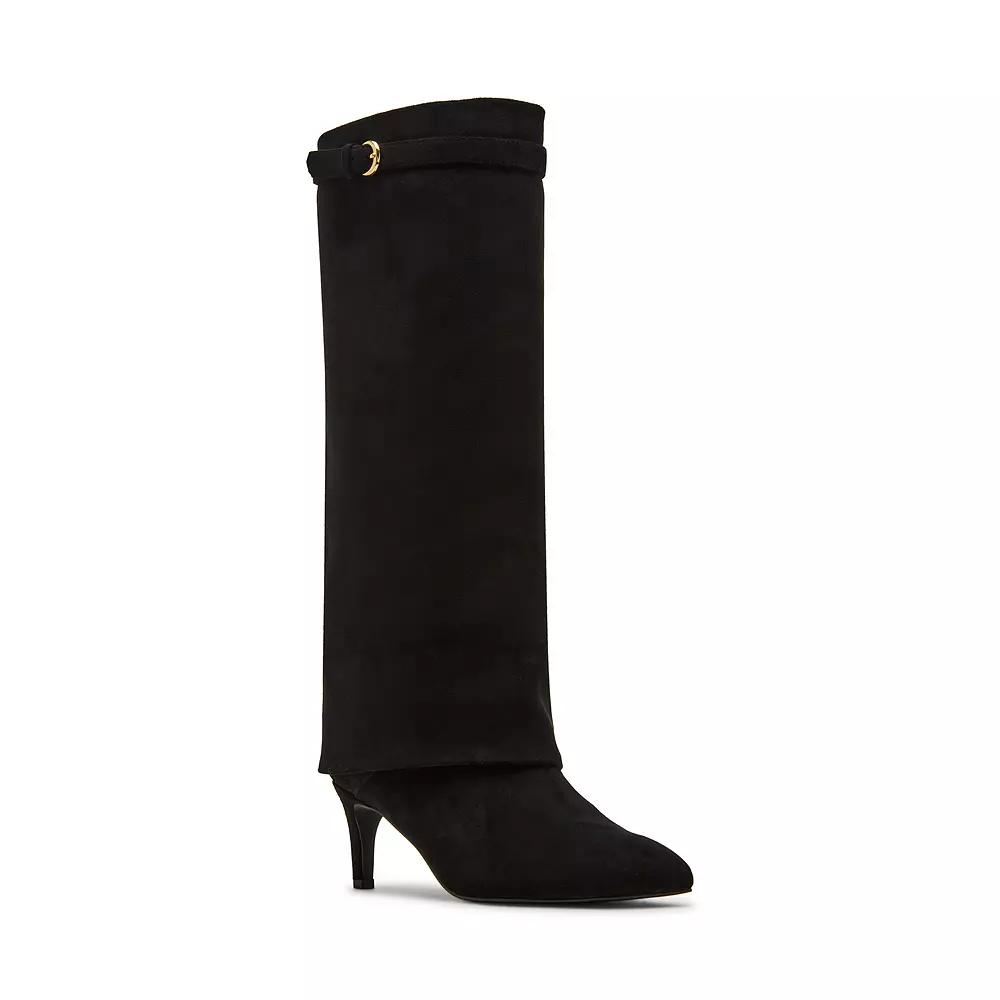 Unleash your fashion-forward spirit with these chic pointed toe boots, showcasing a trendy fold-over design and a stylish buckle strap for that perfect pop of flair. madden girl combines elegance with everyday wearability, making this kitten heel an essential addition to your wardrobe for both casual outings and dressier occasions. Click this FOOTWEAR GUIDE to find the perfect fit and more! - https://www.kohls.com/feature/shoesizeguide.jsp. FEATURES: Buckle shaft strap, Kitten heel, Knee high. DETAILS: Microsuede upper, Jersey lining, PVC outsole, Pointed toe, Pull-on, Polyurethane footbed, 2.5 in. heel, 0.1 in. platform, 14 in. shaft, 14 in. circumference, Spot clean, Imported. Size: 7.5. Color: Black. Gender: female. Age Group: adult. Material: OTHER MATERIAL.