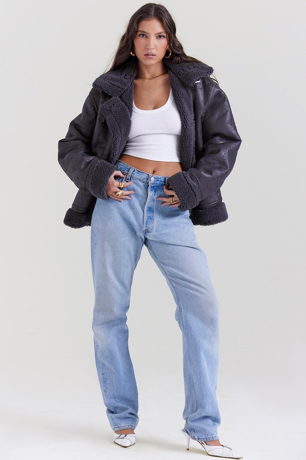 Our 'Madden' jacket is designed in the classic aviator style and is sure to be a forever piece. Cut for an oversized and relaxed fit from soft distressed vegan leather, 'Madden' is tailored to keep you cosy in the coldest temperatures, enhanced by the sumptuously soft faux shearling collar, cuffs and lining layer. We love the vintage feel of the collar tabs and buckle belts. It zips to the front for easy on. Wear yours with tailored trousers or denim. WHERE TO WEAR: Stylish dinner dates, drinks with the girls, bottomless brunches, weekend shopping, city breaks. TEAM YOURS WITH: 'Ria' jeans and ankle boots or classic pumps. Made from vegan leather and shearling. Fully lined.    Stretch Factor: Little Stretch   Designed For House Of CB Shop more Jackets here Length: Approx 69cm Gentle Dry Clean Only   Model is 5 ft 8 and wears size XS   Colour may vary due to lighting on images. The product images (without model) are closest to the true colour of the product. Item runs true to size chart and is cut to suit our size chart. Please refer to our size chart for the best fit. Do not size up or down.