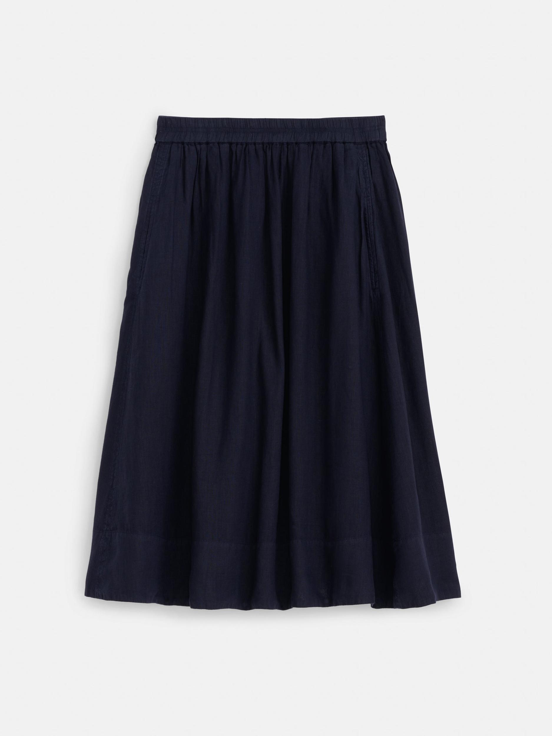 As easy as a skirt gets with the perfect midi length and—drumroll please—an elastic waistband. This time around we went for a lightweight linen for that perfect summer vibe. Fits true to size Hidden elastic waist and pockets Fully lined 100% linen Fits true to size Size small measures 27" around the waist and 29.5" lon