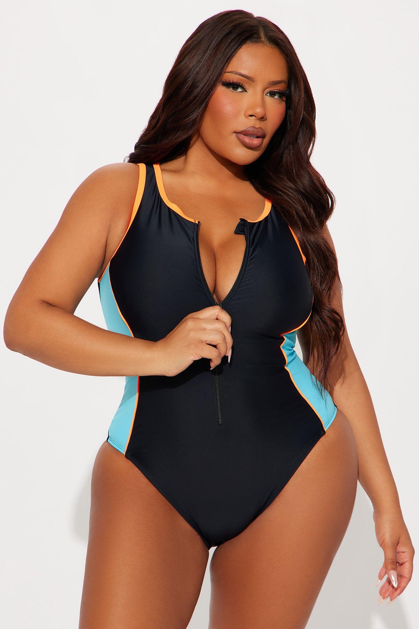 Available In Black/combo. 1 Piece Swimsuit Removable Cups Front Zipper Closure Bikini Bottom Cheeky Contrast Trim Full Stretch Final Sale Shell: 82% Nylon 18% Spandex Lining: 92% Polyester 8% Spandex Imported